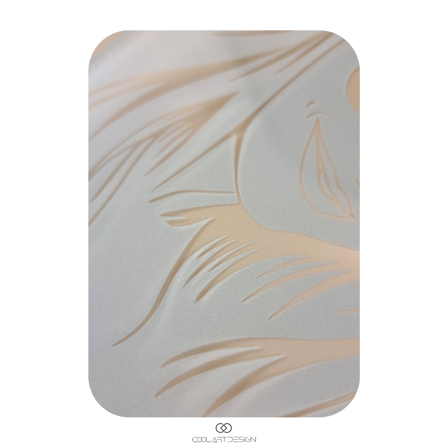 Partendo da un disegno realizzato in alta risoluzione, creiamo una mascheratura vinilica per ricavare un profilo della decorazione su vetro netto e pulito. Attraverso la pregiata tecnica della sabbiatura, il vetro viene delicatamente inciso creando l'effetto satinato. Il risultato finale è un contrasto straordinario tra la trasparenza del vetro cristallino e l'opacità della satinatura.